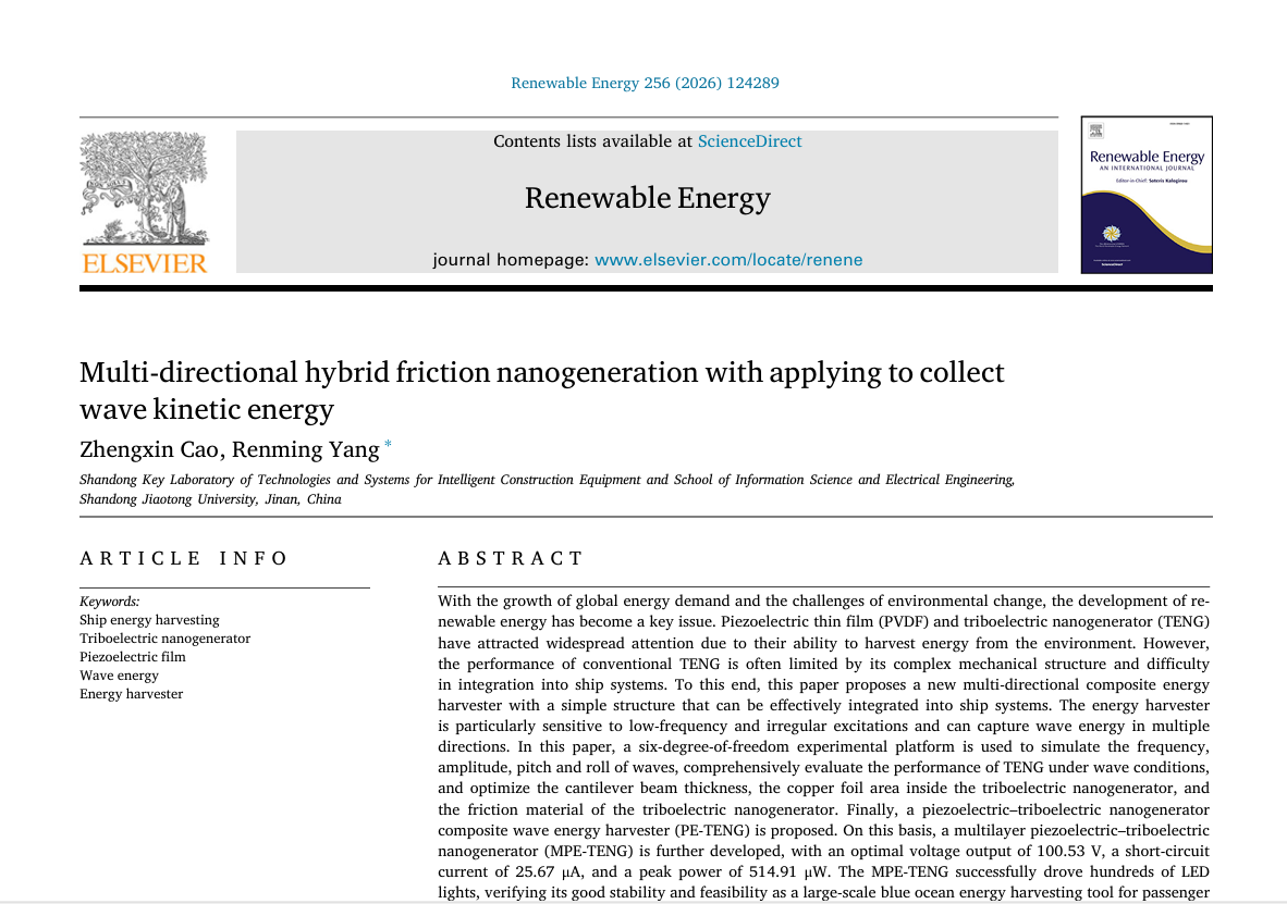 近日,我校信息科学与电气工程学院(人工智能学院)2022级硕士研究生曹正鑫同学在杨仁明教授的指导下,以第一作者身份在国际可再生能源领域权威学术期刊《Renewable Energy》上发表了题为《Multi-directional hybrid friction nanogeneration with applying to collect wave kinetic energy》的研究论文。