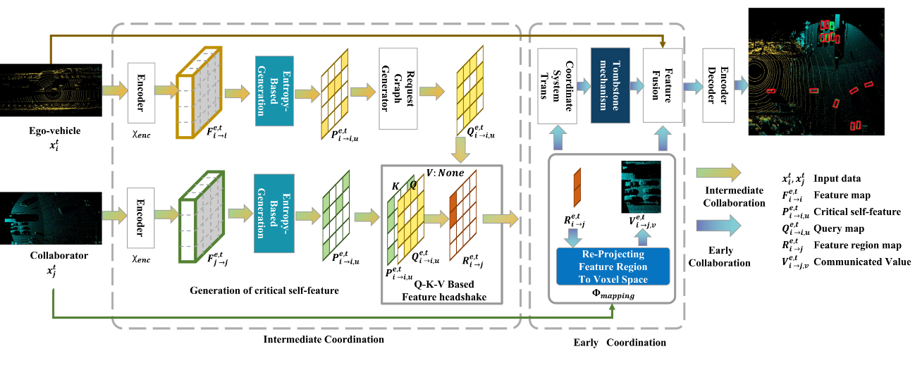 安全性是自动驾驶技术要解决的首要核心问题,得到了学术界和产业界的广泛关注。单个自动驾驶车辆的环境感知,目前受限于遮挡、感知范围有限等问题,还不能满足实际应用要求。多车协同和车路协同感知,使得自动驾驶车辆能够克服上述问题,并提高环境感知能力,但过多的通信开销和感知模型差异会阻碍高效协同。为此,本文提出了一种基于熵理论和特征重投影的协同感知方法(CoEF)。首先,车车通信和车路通信只传递通过熵理论生成的关键区域需求,并在自我车辆和合作者间建立了特征通信映射。其次,提出了一个通用的模型适应性框架,其中每个智能体的特征仅用于通信握手,关键区域被重新投影到体素空间中,以提取关键区域的通信内容。此外,设计墓碑机制来缓存通信内容,以应对通信中断情形,确保可靠性。实验结果表明,相较于典型的V2X-ViT方法, 本文CoEF方法使得通信量降低了63.6%,环境感知精度提升了18.19%,实现了通信带宽和感知精度之间的最优平衡。本文提出的CoEF方法,有助于增强自动驾驶车辆环境感知的精确性和可靠性,提高自动驾驶车辆的安全性。